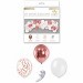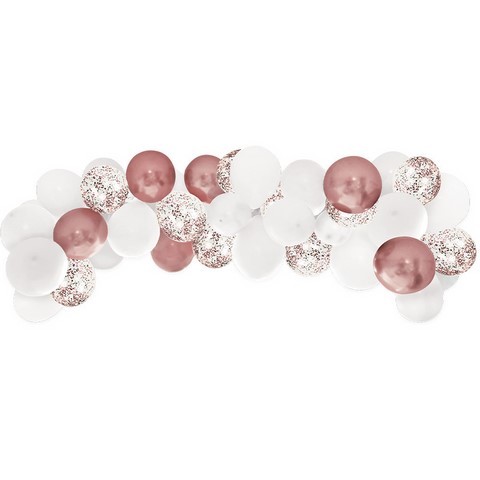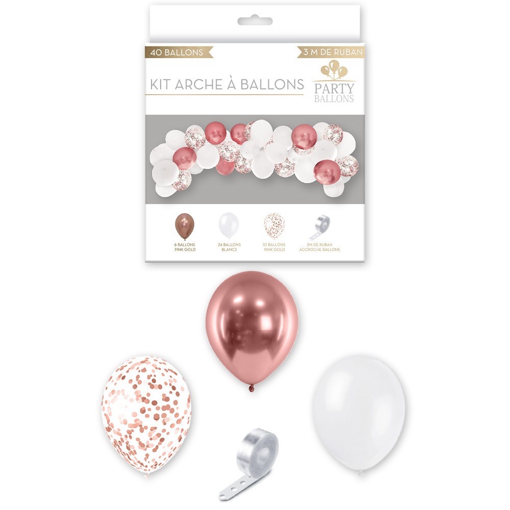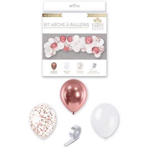 KIT ARCHE A 40 BALLONS ROSE DORE. Que ce soit pour une nouvelle année, un mariage ou un anniversaire, cette arche à ballons rose dorée donnera du volume à votre fête. Composée de quarante ballons de trois modèles différents, elle émerveillera vos invités dès leurs arrivées. 24 ballons blanc / 10 ballons blancs à confettis rose dorés/ 6 ballons rose dorés. Ruban 3 mètres inclus.