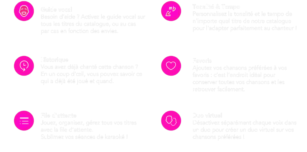 L'organisation de la playlist de la soirée, le guide vocal paramétrable, les favoris et l'ajustement de la tonalité/tempo des chansons font de Karafun le logiciel de karaoké le plus complet !