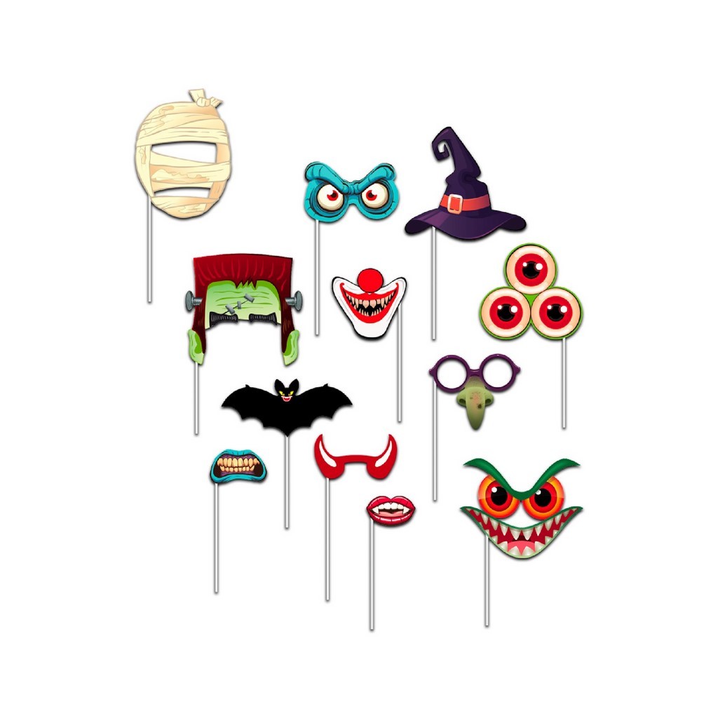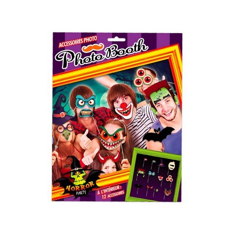 À l'intérieur, vous trouverez 12 accessoires Halloween montés sur tige pour des photos déjantées : dont notamment des fausses perruques, yeux ou autres masques !